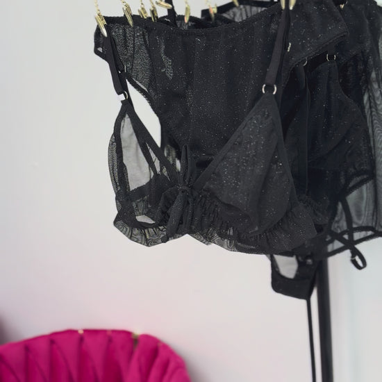 Shimmer and shine with this black sparkling bralette. Crafted from lightweight mesh, it offers a soft, breathable fit with a touch of glamour—perfect for everyday wear or special occasions.